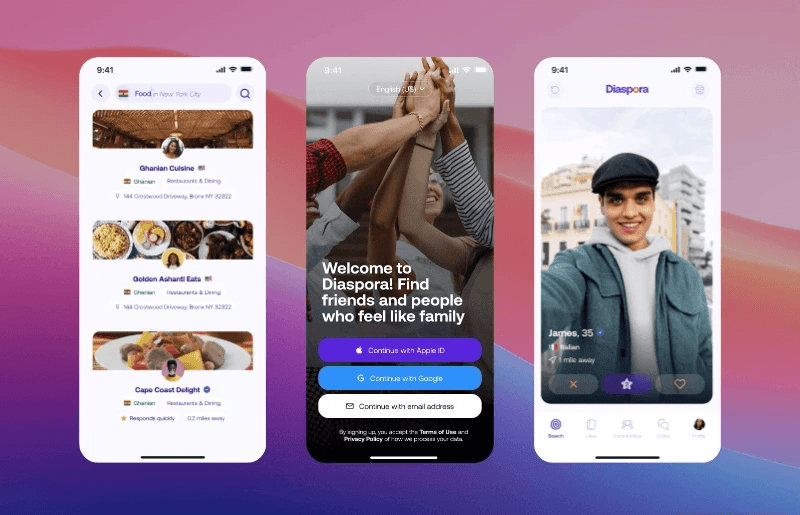 I was the Lead Product Designer for the Diaspora app, where I owned the end-to-end design process—from initial user research and problem definition to high-fidelity prototyping and developer handoff. My work was instrumental in turning the company's bold vision into a fully launched social networking app, now actively used by thousands of people starting a new life abroad.